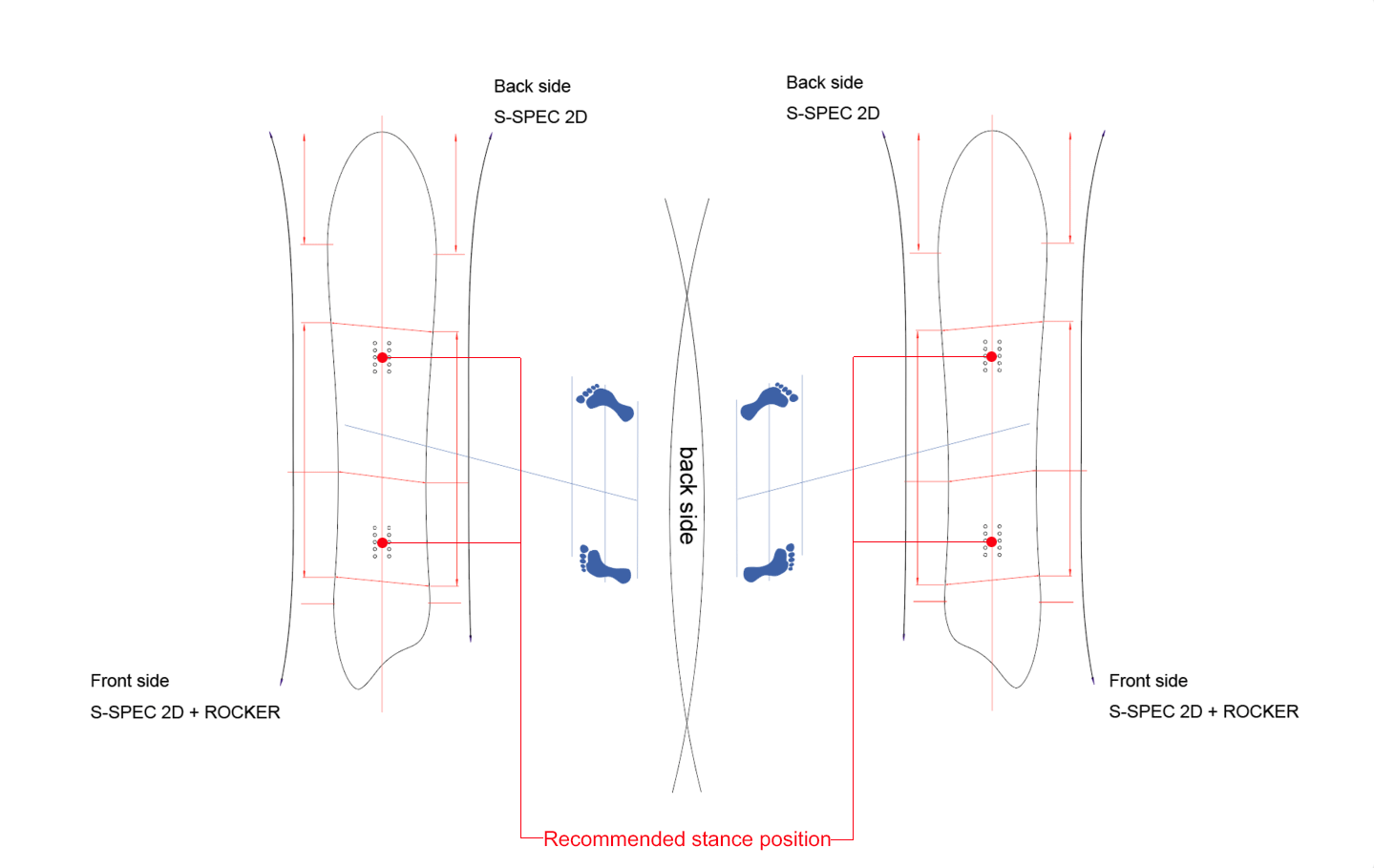 The SVO, with its complete asymmetrical design, is an exceptionally well-designed shape for enhanced maneuverability on sideways-riding snowboards.Not only is the outline shape asymmetrical, but the positions of the side curves, as well as the camber and rocker shapes, are also completely asymmetrical. The asymmetrical design of the FIELD EARTH stands in direct contrast to the asymmetrical shapes commonly found in traditional alpine boards.Due to the sideways orientation of snowboarding, there is a difference in edge length between the nose and tail, resulting from the angle at which the rider's feet are positioned. Additionally, performing turns on the backside, which is the side opposite to the rider's front side, can be more challenging due to the longer edge on the backside, which is influenced by the body's structure.Furthermore, the SVO adjusts the set stance angle through the board shape, making it easier to control both sides with the same sensation. However, when considering turns on packed snow alone, a simple shape that offsets the edges between the left and right sides (with the backside extending further back) is effective. Yet, such a shape can cause significant resistance on the backside in powder conditions, leading to slower turns. To address this, the SVO is designed with a shorter backside shape for powder, while ensuring that the edge contact on packed snow favors a longer backside, creating a truly opposite design that allows for two different sensations on a single board.As a result, the SVO enables precise turns on packed snow while offering incredibly nimble turns in powder. While the SVO boasts a highly distinctive design, it is ultimately crafted to make sideways-riding vehicles like snowboards exceptionally easy to control. Experience the ultimate ease of riding with the SVO.