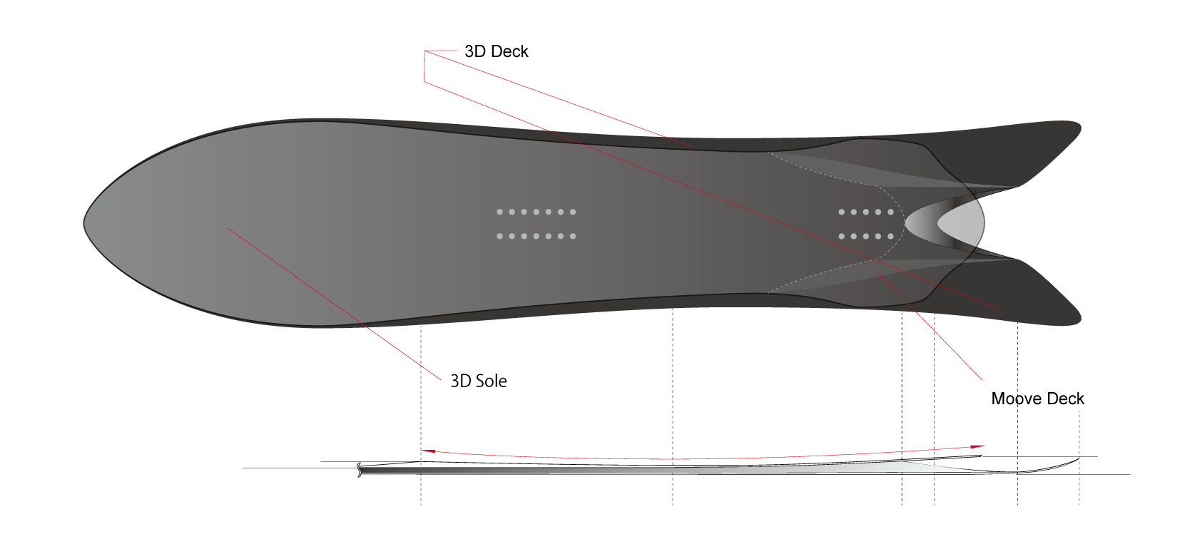 Also, riders can weight without catching vibration from snow surface because contacting point of snow surface and binding’s point of contacting snow surface are separated each other. This is a distinct feature of this model.